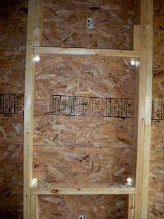 We're attaching it directly to the wall of the shop so it took some creativity. But, this wall was finished (including the electrics wired) and the North wall has been framed.